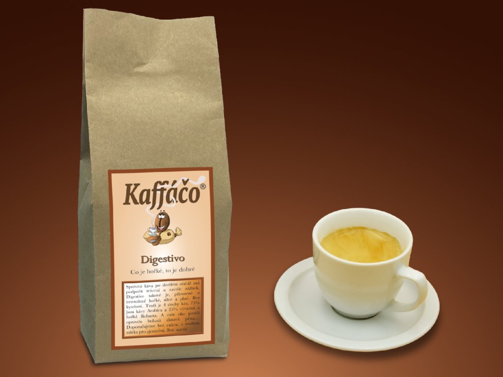 Správná káva po skvělém obědě má podpořit trávení a završit zážitek. Digestivo takové je, přirozeně a intenzivně hořké, silné a plné. Bez kyselosti. Tvoří je 4 druhy káv z Jižní Ameriky, Jihovýchodní Asie a Afriky. 75% jsou kávy Arabica a 25% výrazně hořká Robusta. A vaše oko potěší opravdu bohatá zlatavá pěna.... Doporučujeme bez cukru, s troškou mléka pro zjemnění. Bon apetit!