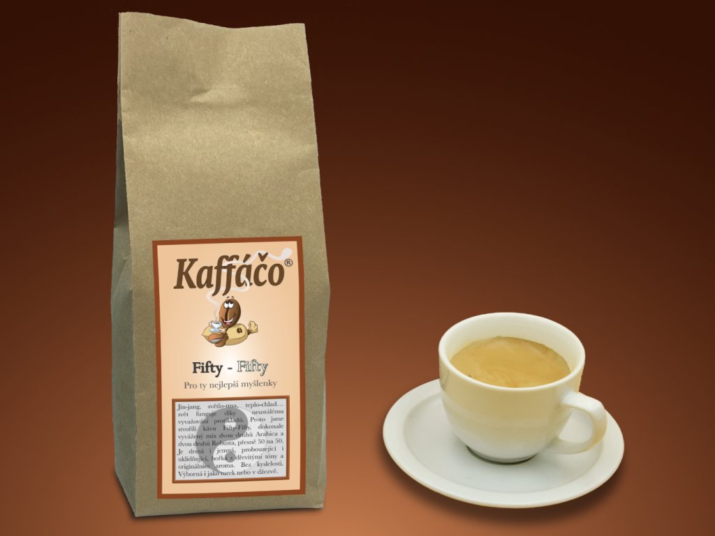 Jin-jang, světlo-tma, teplo-chlad…svět funguje díky neustálému vyvažování protikladů. Proto jsme stvořili kávu Fifty-Fifty, dokonale vyvážený mix Arabik a Robusty, přesně 50 na 50. Je drsná i jemná, s mnoha tóny a originálním aroma. Bez kyslelosti. Zkrátka káva pro filozofy, dobrodruhy a vůbec všechny hledající…. Výborná i v džezvě či jako turek.